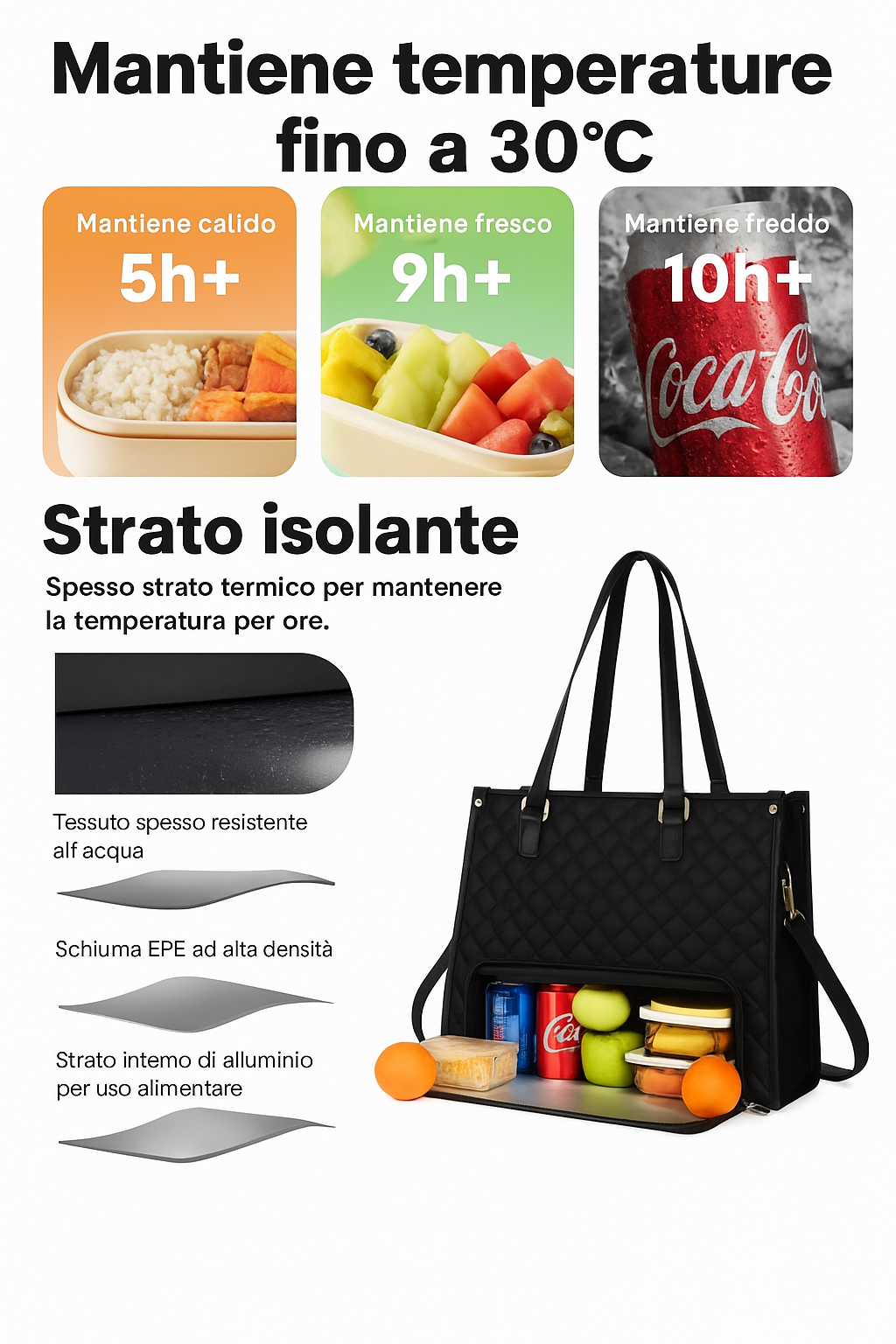 Questa borsa è dotata di un scomparto termico nascosto che mantiene il cibo fresco e discreto — niente odori, niente stress, solo design intelligente.